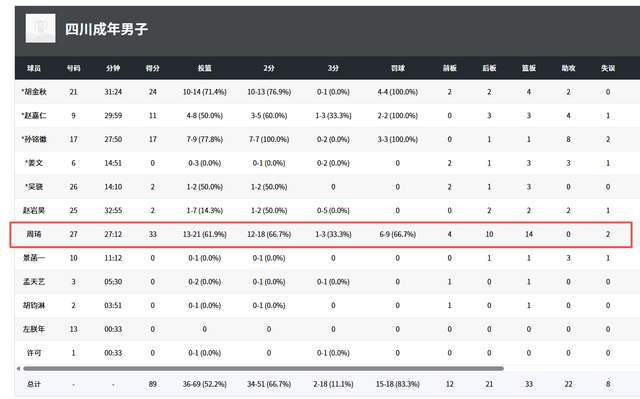 周琦真是太不讲情面了,面对自己所在的俱乐部,居然火力全开,打了27分钟,21投13中,三分球3投1中,9罚6中,砍下全场最高的33分14篮板,丝毫不顾忌老帅许利民的压面,也算是条汉子了。胡金秋14投10中,4罚4中,拿到24分4篮板。孙铭徽17分8助攻。赵嘉仁11分4助攻。