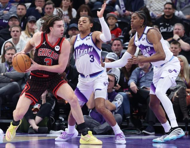 公牛过去4场连输雄鹿、骑士、马刺与活塞遭遇4连败,爵士上一场主场122-132输给老鹰。本场公牛缺少科林斯,怀特复出赛季首秀,吉迪也复出,爵士缺少李凯尔、凯斯勒、亨德里克斯与尼昂。首节双方均是轰下30+得分展开对攻,公牛开局3-10落后,并在之后17-24落后。公牛持续追分,两队首节均是没有球员得分上双,但借助团队攻势同样打出高得分,首节结束双方维持33-33。公牛三分14中5,吉迪3中0得到2分3助攻,爵士三分16中4,马尔卡宁8中3得到9分。